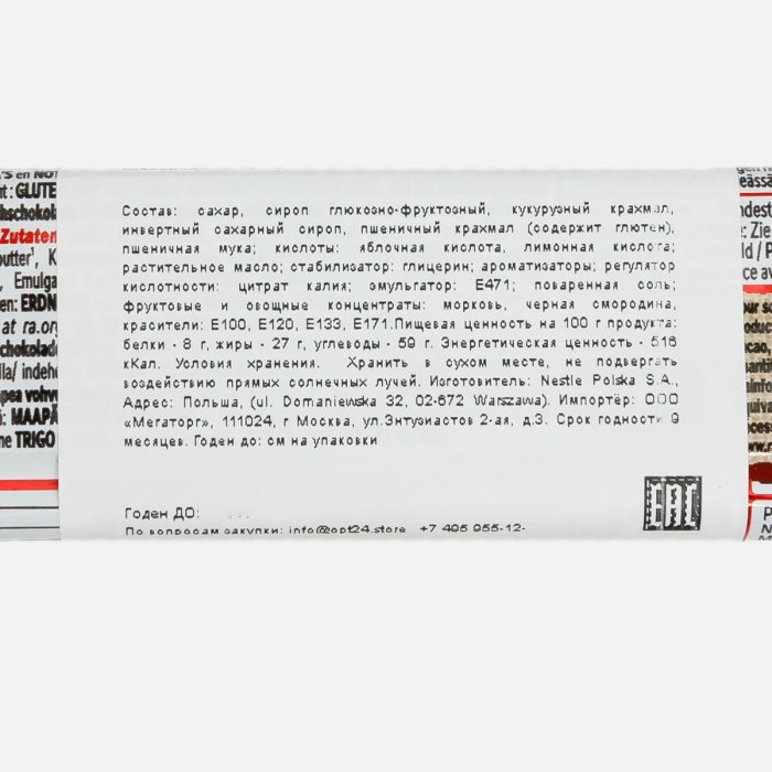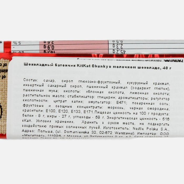 сахар, пшеничная мука, сухое обезжиренное молоко, растительные жиры (пальмовые, ши), какао-масса, какао-масло, жиры из молока, сухая сыворотка (из молока), какао-порошок с низким содержанием жира, эмульгатор (лецитины), разрыхлитель (карбонаты натрия).