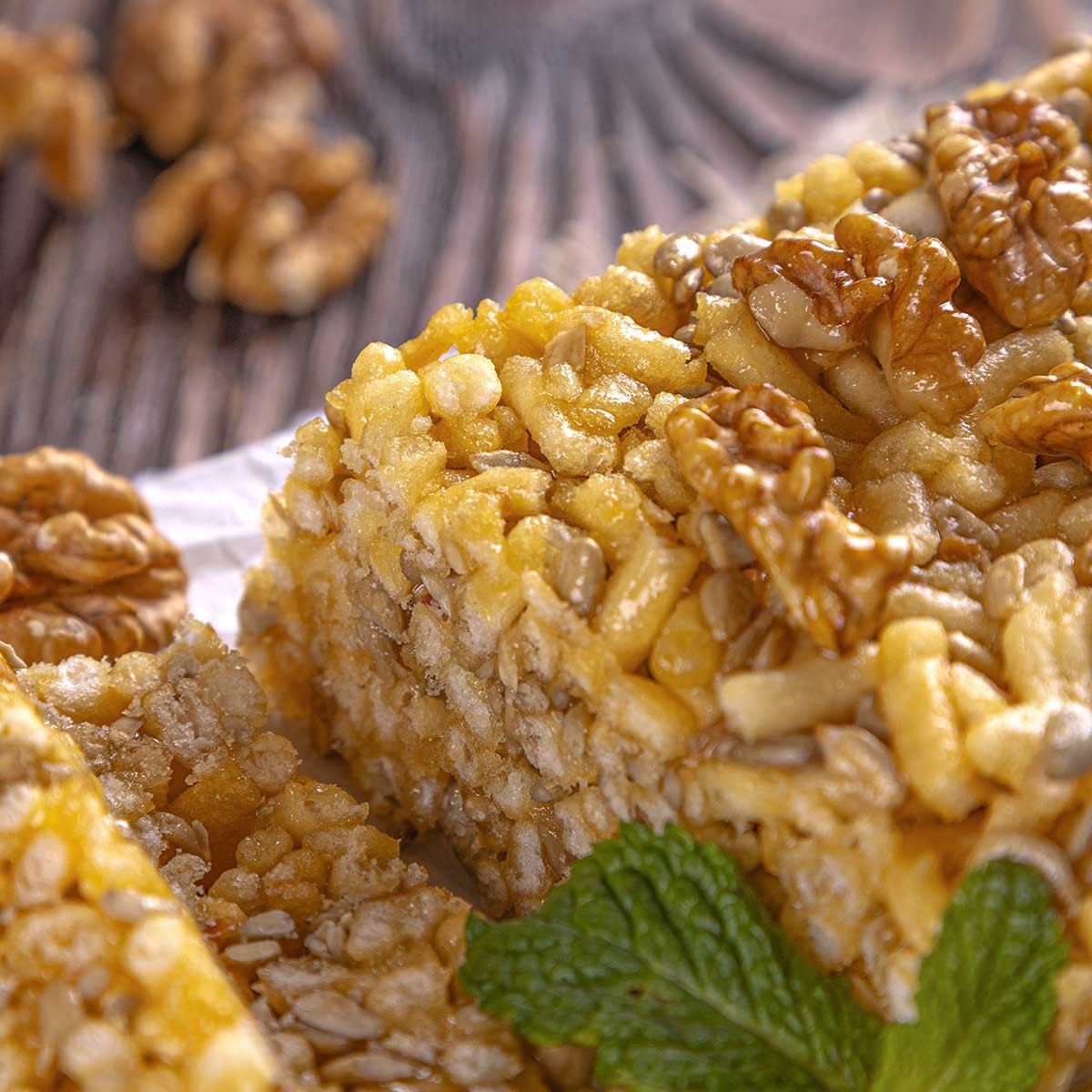 Сладкая медовая горка из обжаренных кусочков теста. Традиционный десерт с ярким гармоничным вкусом, который дополнен хрустящей текстурой семян подсолнечника и ореховыми нотками. Невероятно ароматный и сочный десерт, который по праву считается важнейшим нематериальным наследием татарского народа.