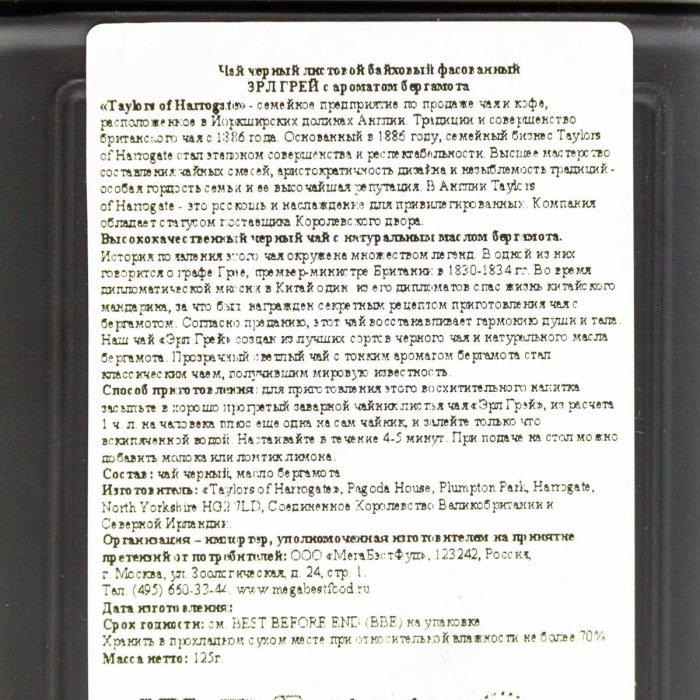 Чай ТэйлорОфХаррогейт Эрл Грей с ароматом бергамота ж/б 125г