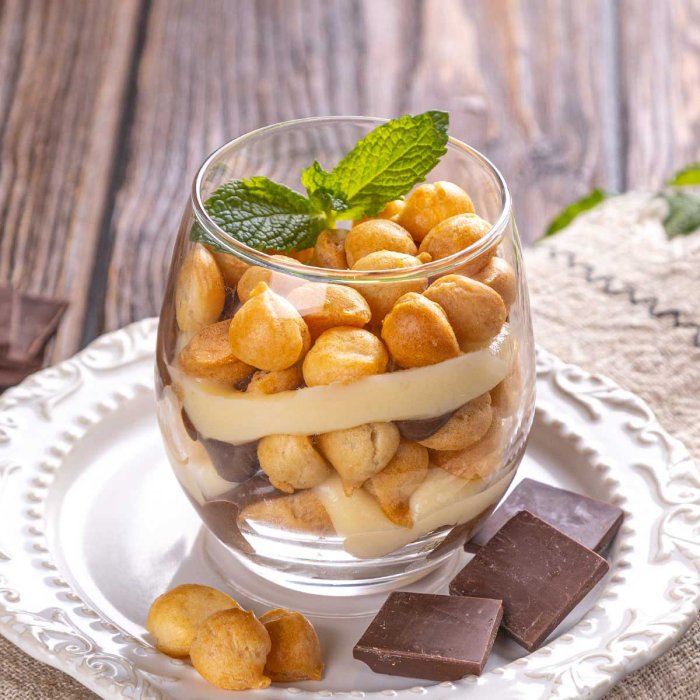 Основу этого десерта составляют золотистые профитроли из заварного теста с воздушным сливочным кремом. Также особую яркую шоколадно-кофейную ноту дарит какао порошок. Легкое нежное лакомство, которое тает во рту, удивляя своим гармоничным и изысканным вкусом. Красивый десерт упакован в удобный пластиковый контейнер, который легко можно взять с собой, не нарушив эстетики блюда.