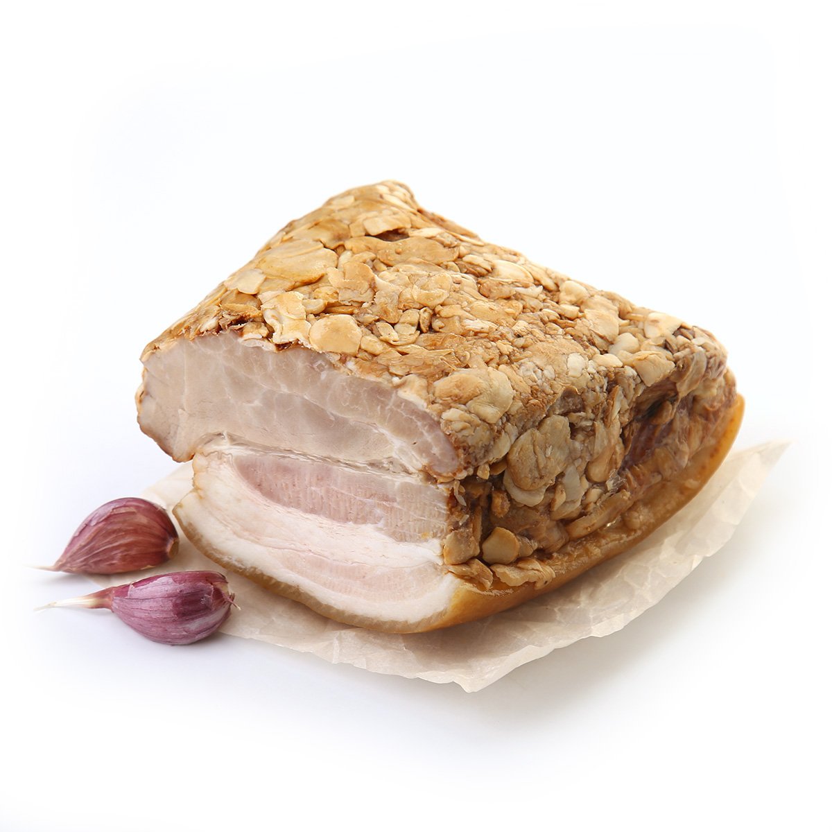 Варено-копченая свиная грудинка в обсыпке из специй и свежего мелко нарубленного чеснока.