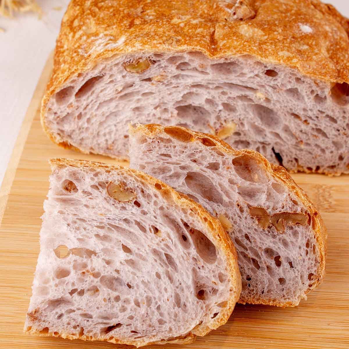 Итальянский хлеб, созданный по оригинальной рецептуре с добавлением дробленых грецких орехов. Этот хлеб отличает пористая структура и необычный, слегка сиреневый цвет. Во вкусе гармонично сочетается маслянистый, поджаристый аромат самой чиабатты с характерными тепло-сладковатыми нотками. Итальянская выпечка станет прекрасной основой для самых невероятных закусок, бутербродов и брускетт. Благодаря своему сбалансированному вкусу, она создана для того, чтобы идеально раскрыть и подчеркнуть вкусы различных ингридиентов.