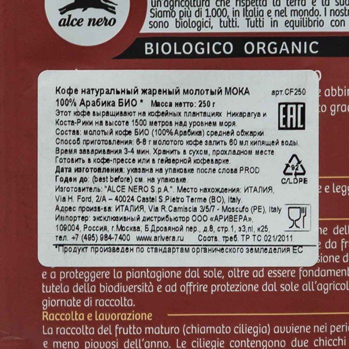 Кофе Альче Неро Арабика Натур жареный молотый био в/у 250г