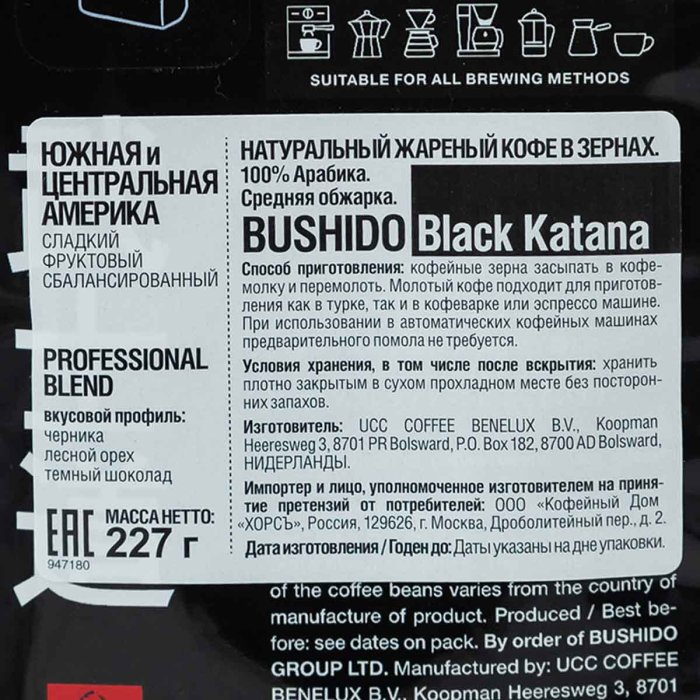 Кофе Бушидо Блэк Катана в зернах м/у 227г