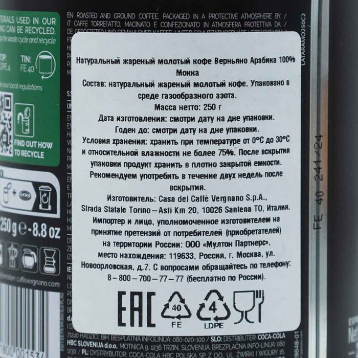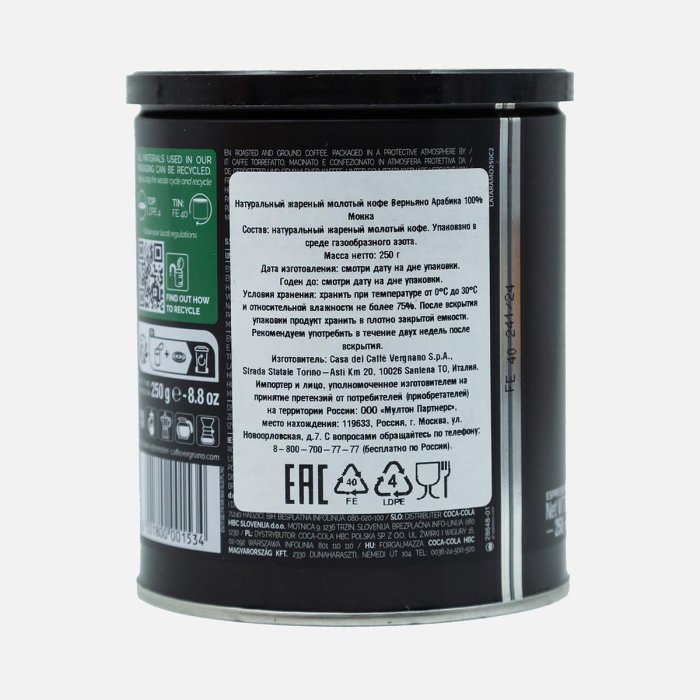 Кофе Вергнано Арабика Мока молотый ж/б 250г