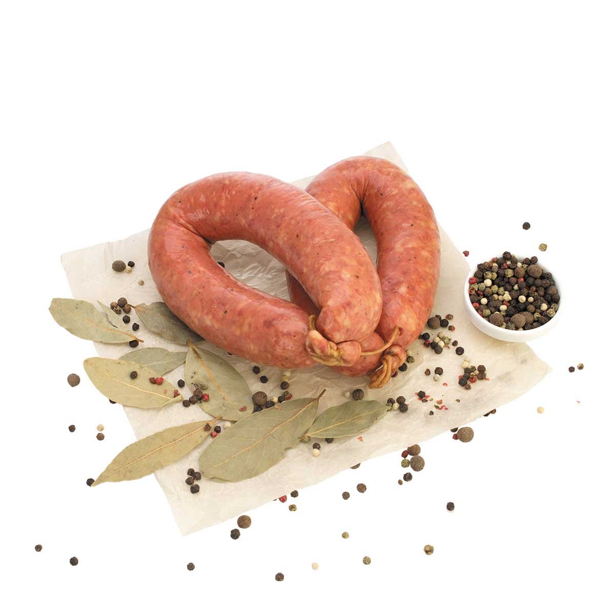Говядина, свинина, шпик, соль нитритная, сахар, пряности (перец черный молотый, перец душистый молотый), чеснок, специи.