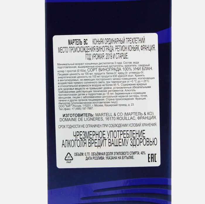 Коньяк Мартель ВС трехлетний 40% п/у 0,7л