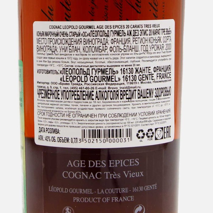 КоньякЛеопольдГурмель Аж дезЭпис 20 карат Тре Вье мароч ОС 43% п/у 0,7л