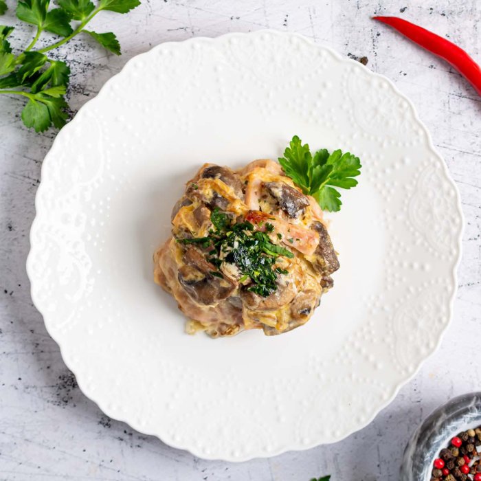 Филе бедра цыпленка, майонез, ветчина, грибы шампиньоны, лук репчатый, масло подсолнечное, соль, перец черный молотый.