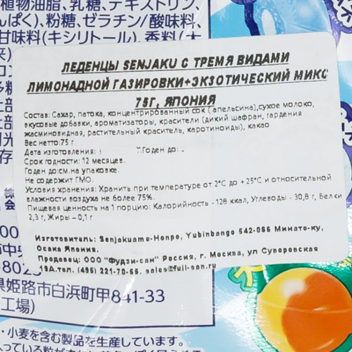 сахар (производство Япония), крахмальный сироп, эритрит, глюкоза, лактоза, сахарная пудра, желатин /подкислитель, пищевая сода, подсластитель (ксилит), ароматизатор, витамин С, обработанный крахмал, красители (карамель, гардения, куркума, анатоль), полисахариды, загуститель, осветлитель. без ГМО