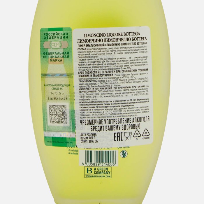 Ликер Боттега Лимончино Лимончелло эмульсионный 30% ст/б 0,5л