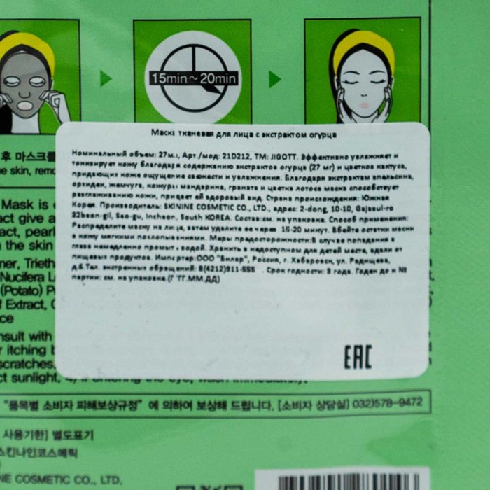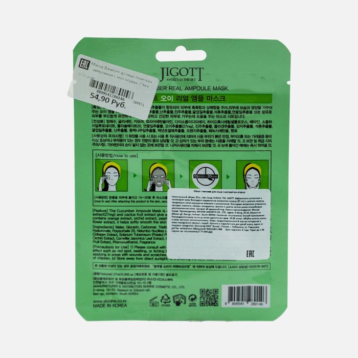 Маска Джиготт д/лица тканевая ампульная с экст огурца 27мл