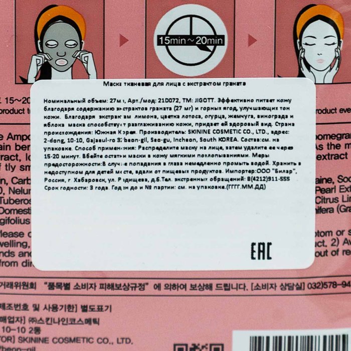 Маска Джиготт д/лица тканевая с экстрактом граната 27мл