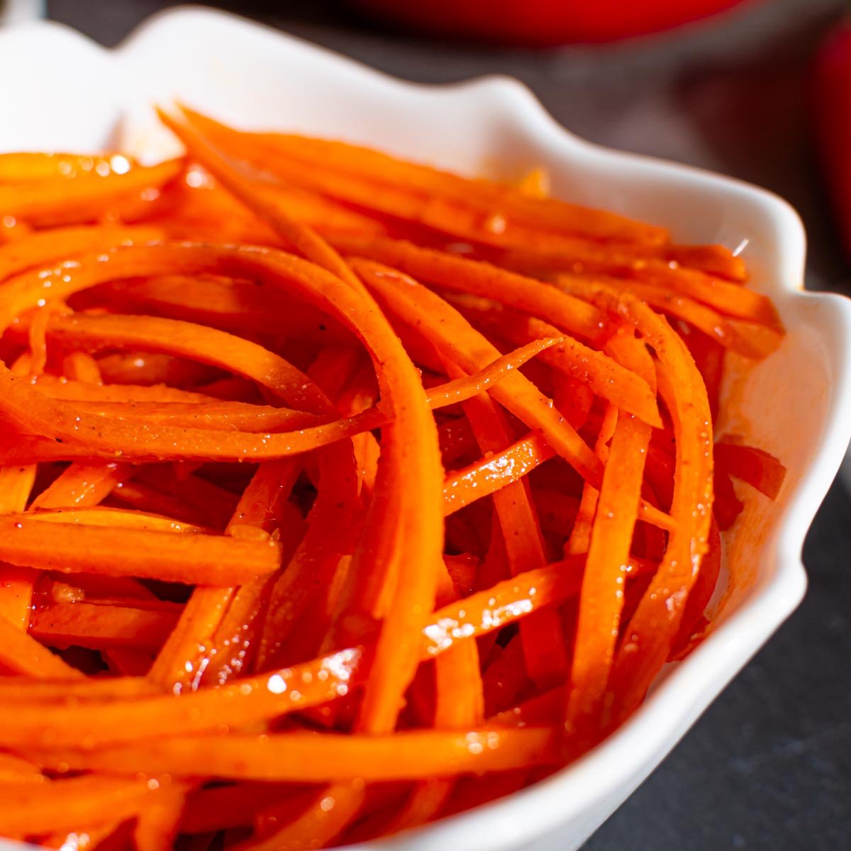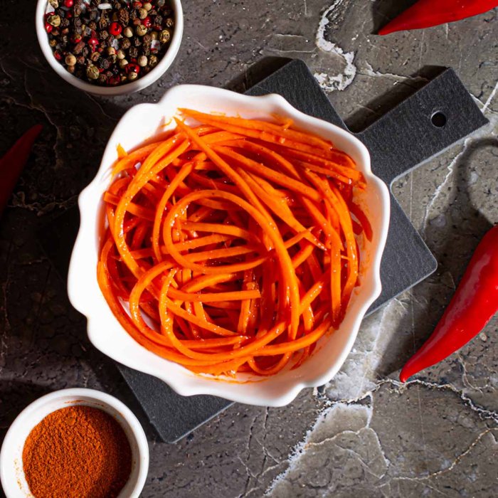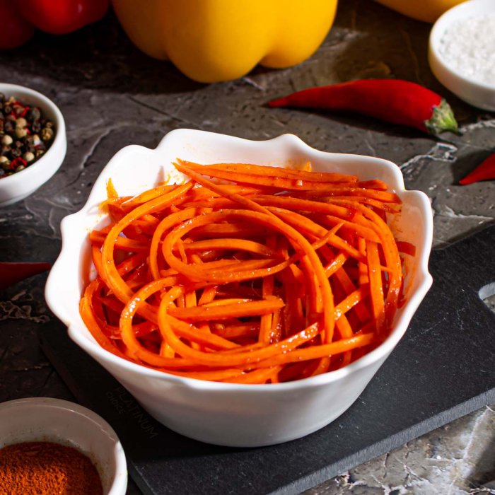 Сочный пикантный салат с характерными азиатскими мотивами. Хрустящая ароматная морковь с кисло-сладкими пряными нотами. Естественная сладость овоща сбалансирована легкой кислинкой и умеренной жгучестью перца. Универсальное блюдо, которое может быть, как самостоятельной закуской или гарниром, так и служить ингредиентом для различных салатов.