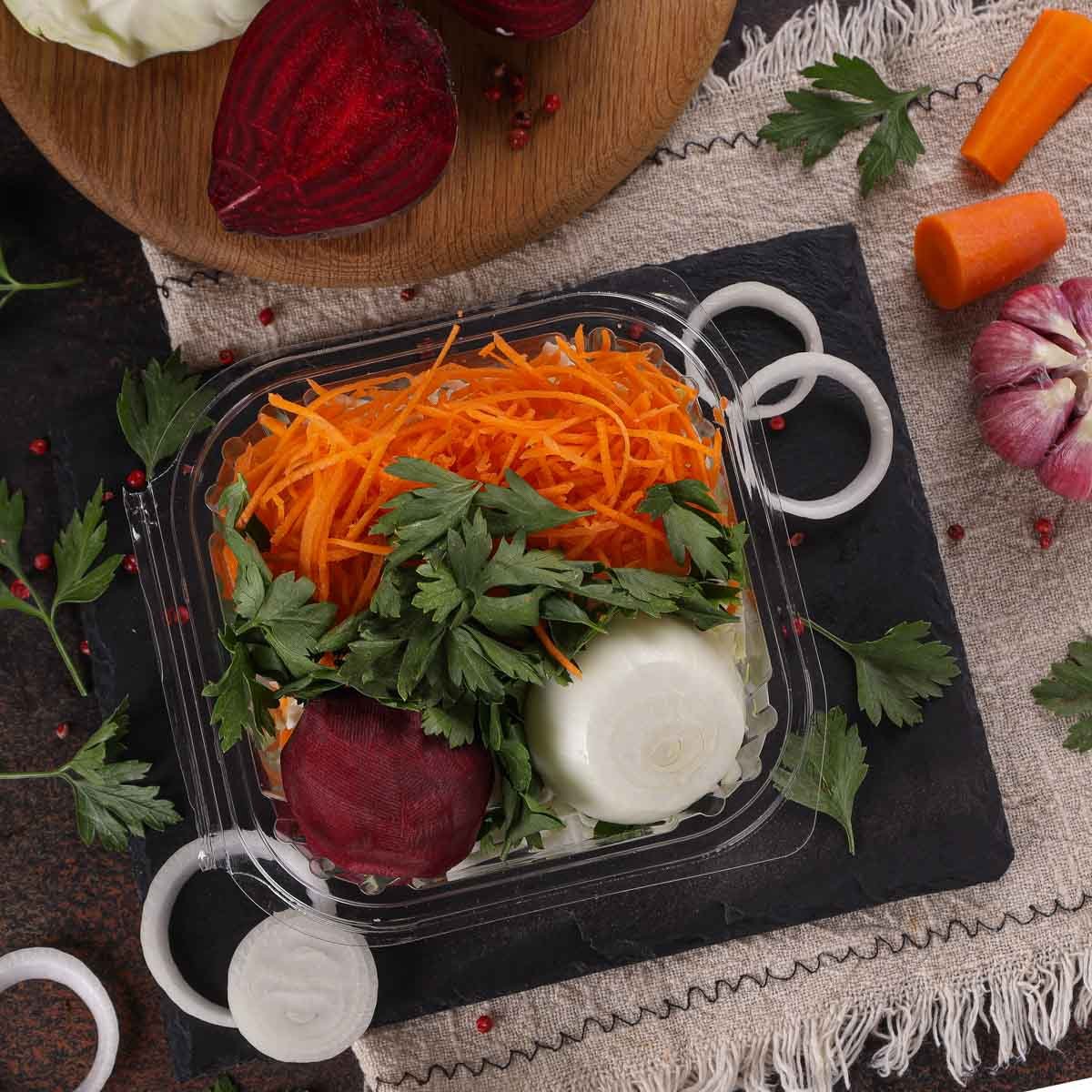 Капуста б/к, свекла, лук репчатый, морковь, зелень, лавровый лист.