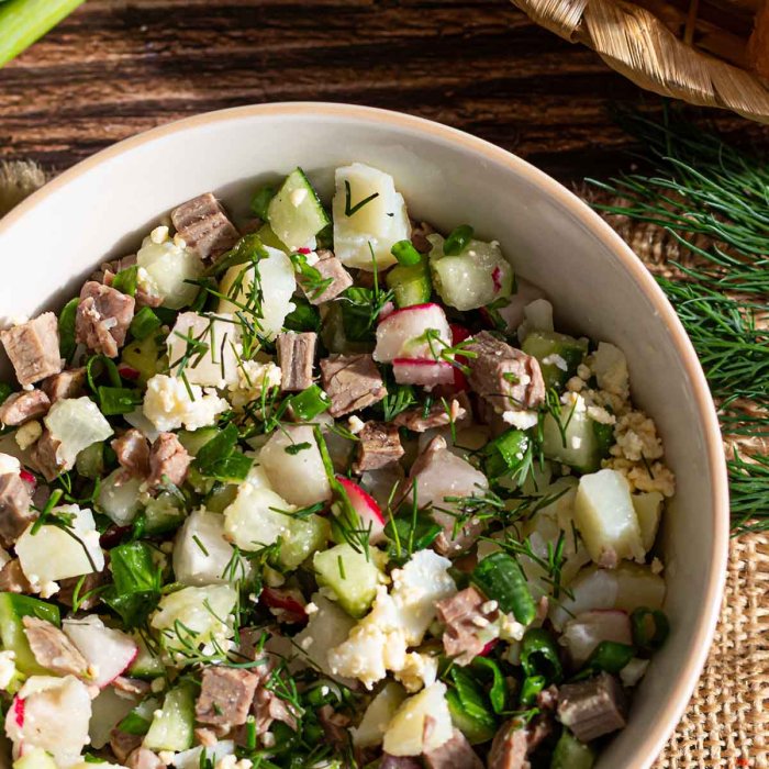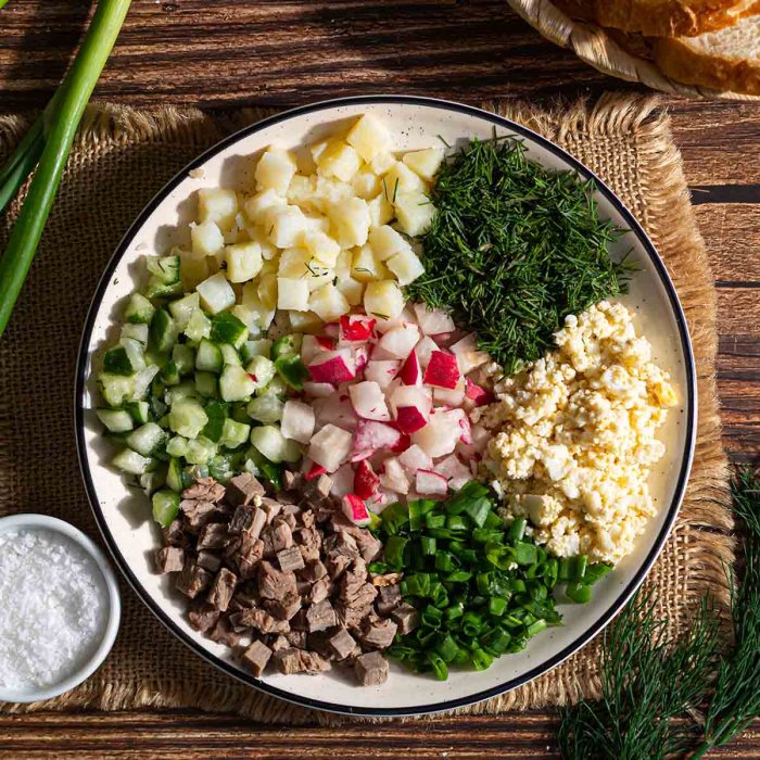 Попробуйте нашу заготовку для освежающего, но сытного первого блюда. Отборные кусочки говядины, свежий огурец, редис, отварной картофель, яйцо, зеленый лук и пряная зелень – идеальный вкус лета! Добавьте наш квас, кефир или мацони и наслаждайтесь!