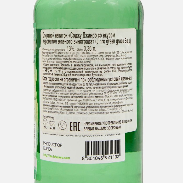 Напиток спирт Соджу Джинро со вкус и аромат зелен винограда13%с/б0,36л