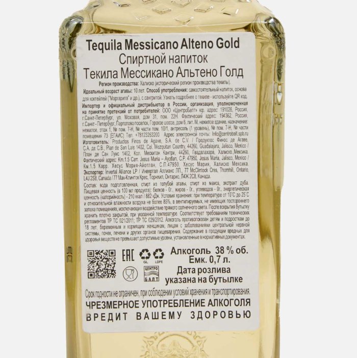 Напиток спиртной Текила Мессикано Альтено Голд 38% ст/б 0,7л