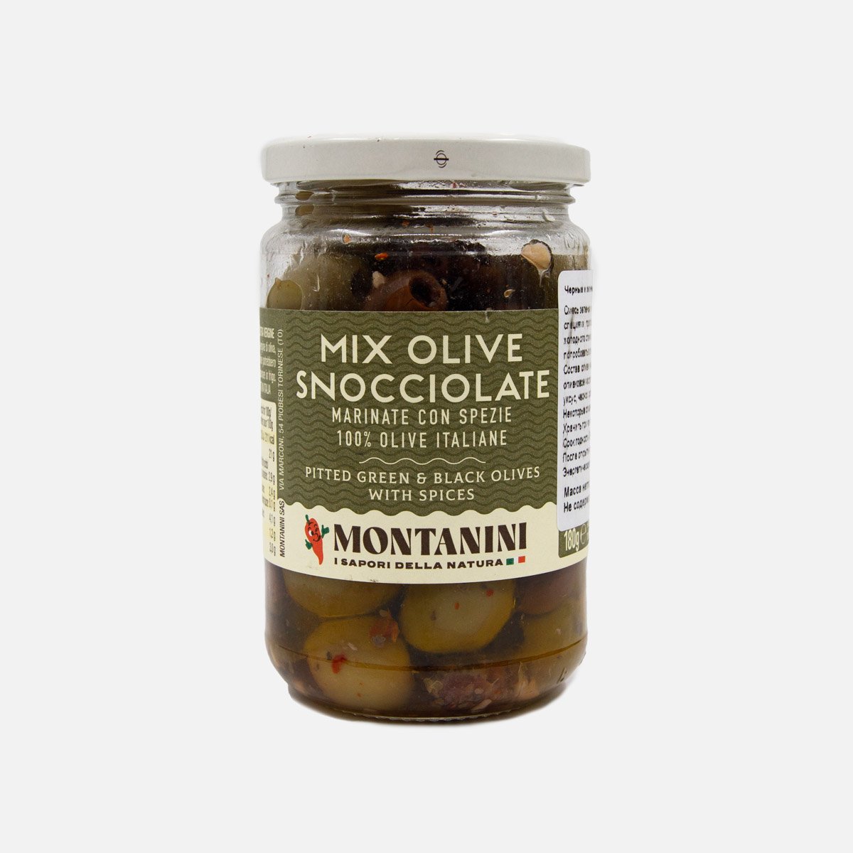 Оливки Монтанини черн/зелен без косточек маринованные со спец 180г