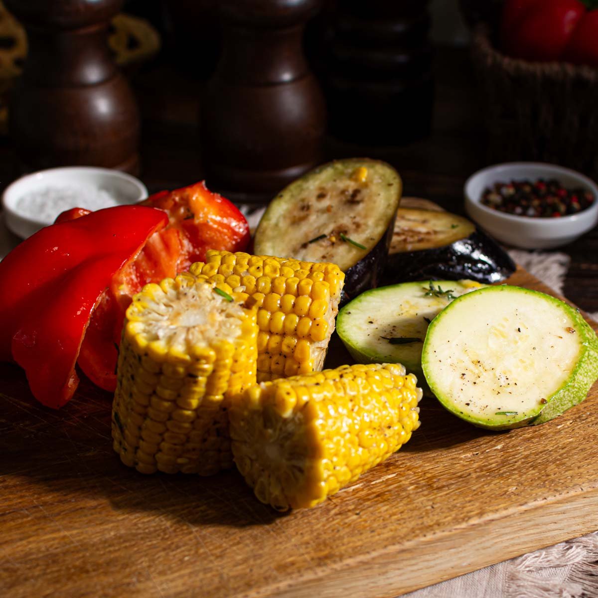 Кабачки, баклажаны, перец болгарский, кукуруза в початках, масло подсолнечное, розмарин, перец черный горошек, соль.