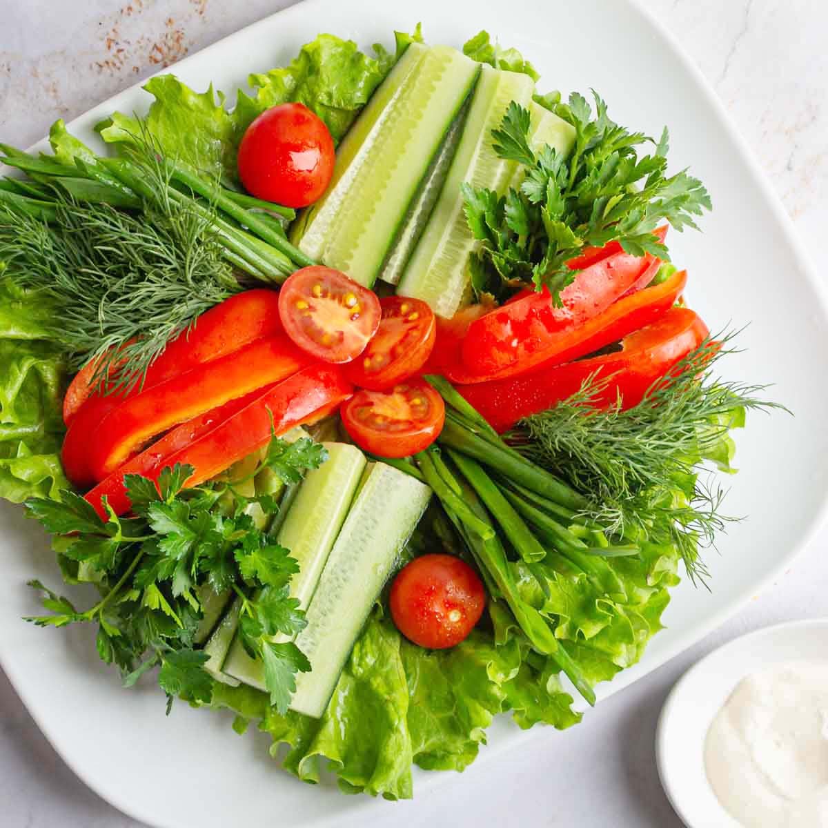 Томаты, огурцы, болгарский перец, стебель сельдерея, редиска, лист салата, лук зеленый, зелень петрушки, зелень укропа