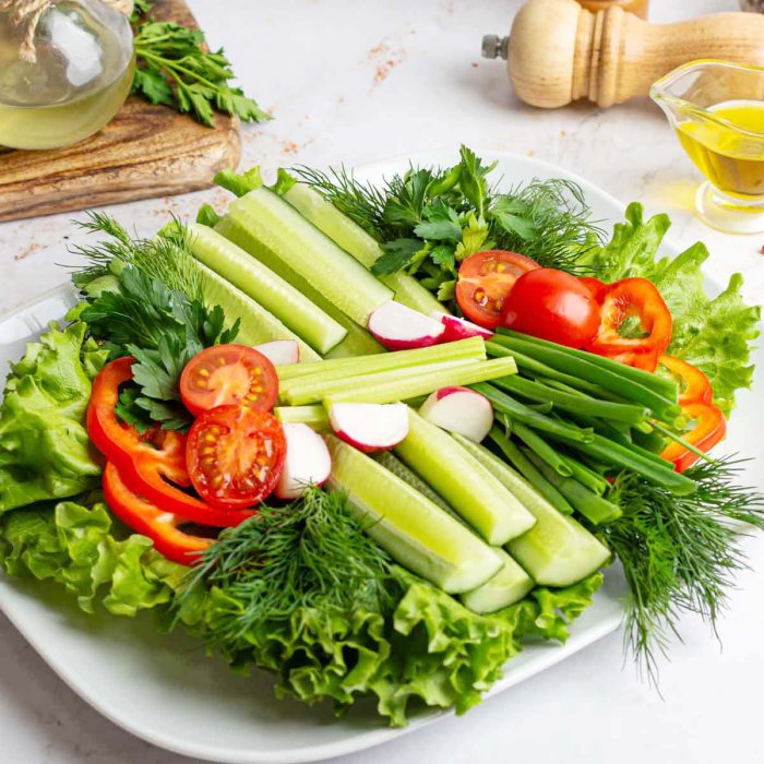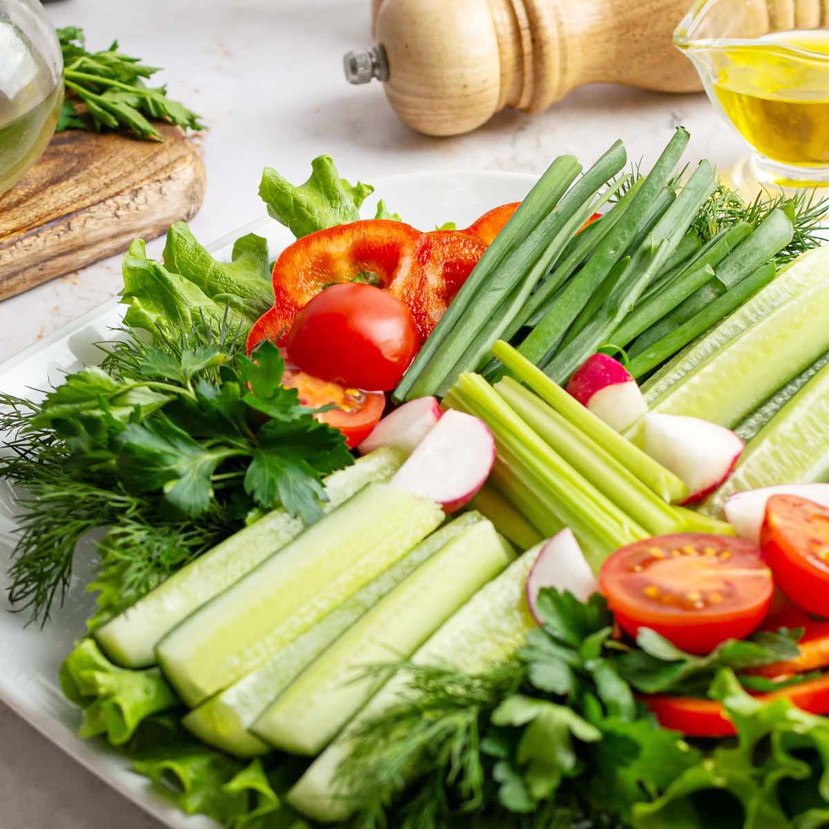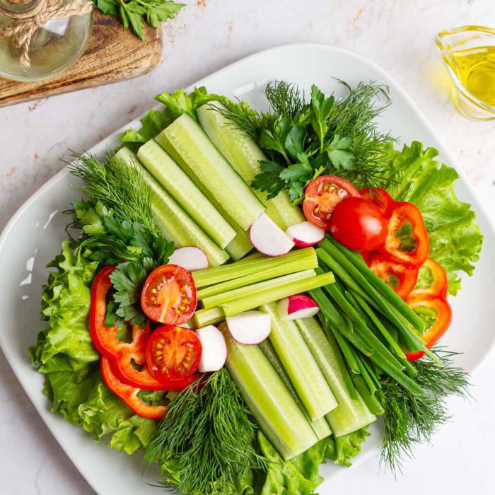 Огурцы свежие, томаты черри свежие, перец болгарский, редис, салат зелёный, сметана, майонез, зелень, чеснок