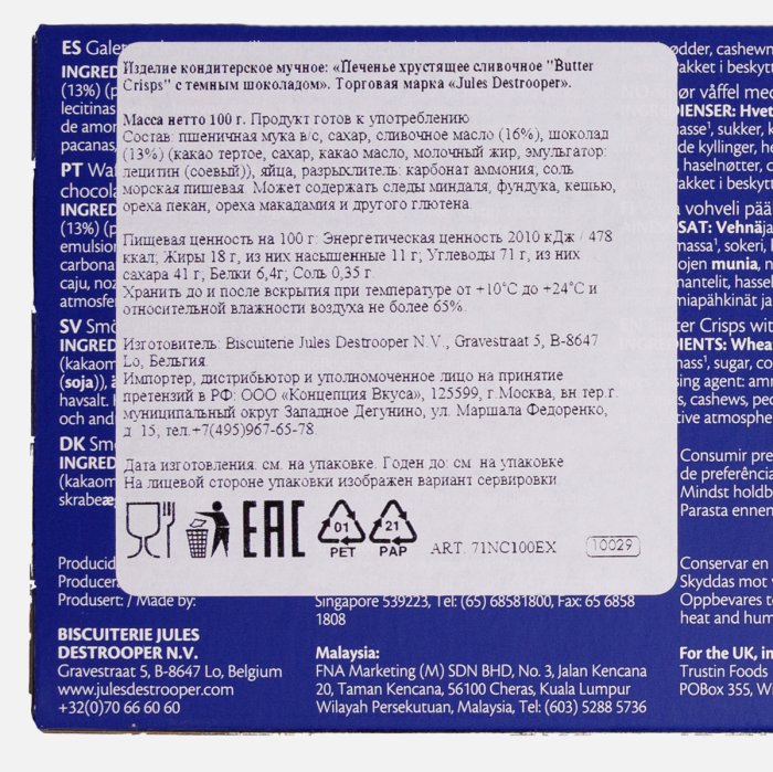 пшеничная мука в/с, сахар, сливочное масло (16%), шоколад (13%) (какао тертое, сахар, какао масло, молочный жир, эмульгатор: лецитин (соевый)), яйца, разрыхлитель: карбонат аммония; соль морская пищевая. Может содержать следы миндаля, фундука, кешью, ореха пекан, ореха макадамия и другого глютена.