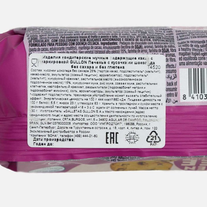 Печенье Гуллон с кусочками шоколада без сахара и без глютена 130г