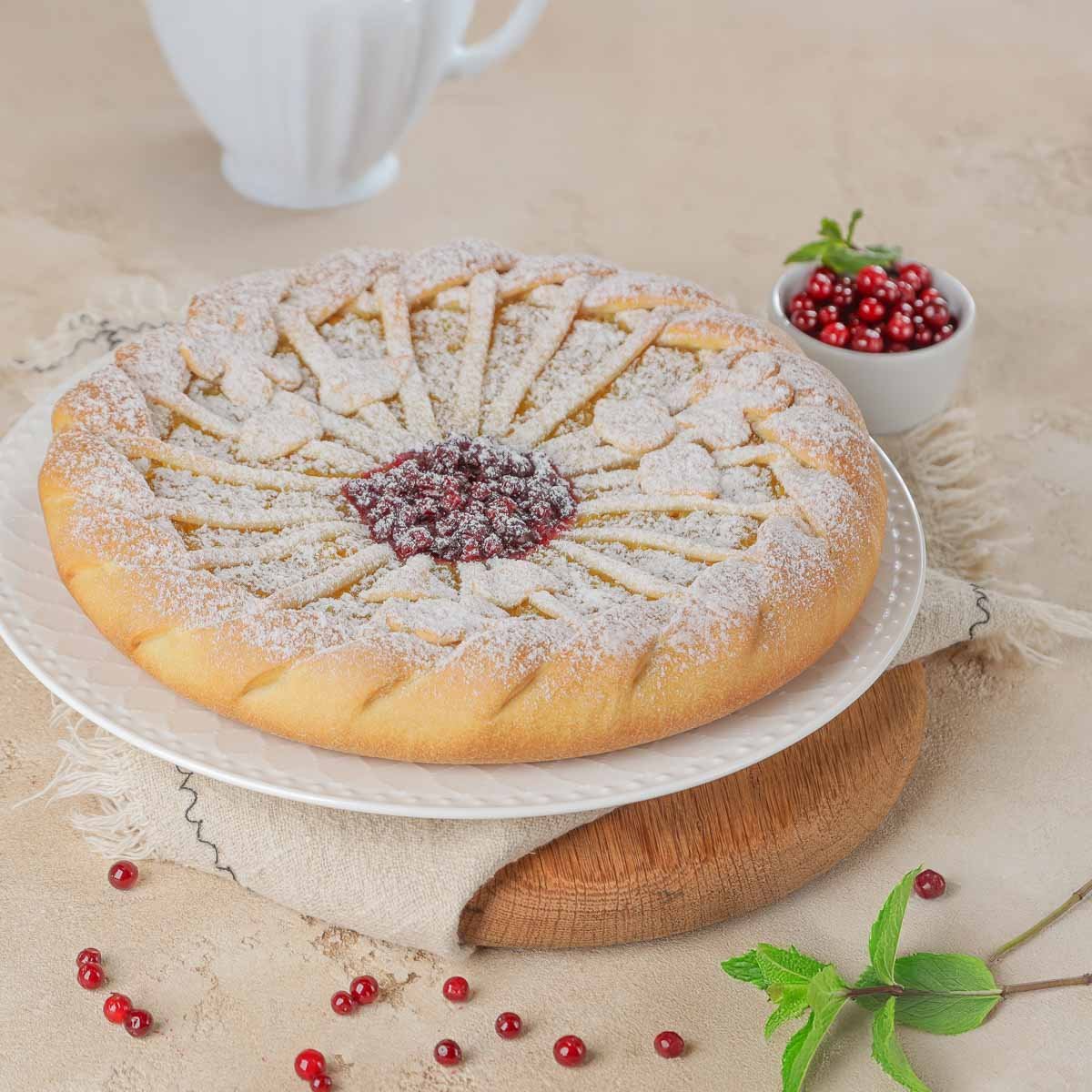 Фирменный пирог с насыщенным фруктово-ягодным вкусом и многогранным ароматом – лучшее средство от хандры в серые дождливые дни. Благодаря сочной начинке из солнечных апельсинов из южных стран в сочетании с особым вкусом брусники из наших лесов, мы создаем яркий сбалансированный десерт. Красивая витаминная выпечка станет настоящим украшением для праздничного стола.