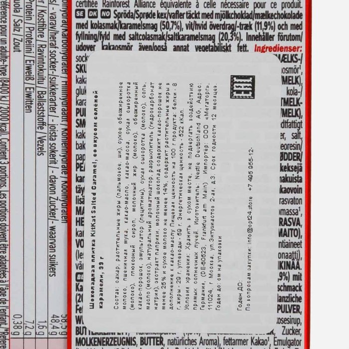 сахар, растительные жиры (пальмовое, ши), сухое обезжиренное молоко, пшеничная мука, какао-масло, какао-масса, сухая сыворотка (молоко), глюкозный сироп, молочный жир (молоко), обезжиренный какао-порошок, эмульгатор (лецитины), сухая сыворотка (молоко), соль, масло (молоко), натуральный ароматизатор, разрыхлитель (гидрокарбонат натрия), экстракт паприки, молочный шоколад содержит какао-порошок не менее 25% и сухое молоко не менее 14%, содержит растительные жиры в дополнение к какао-маслу.