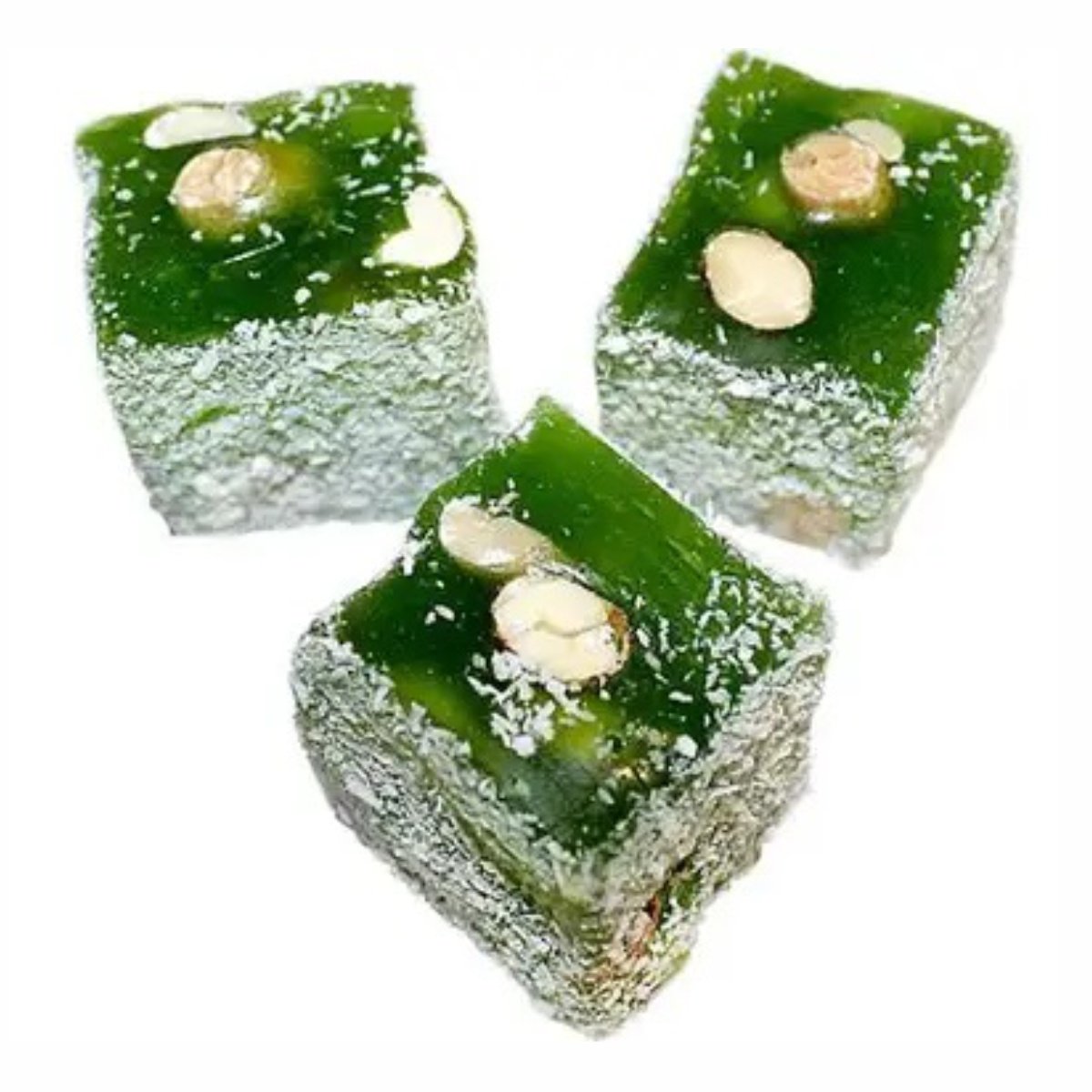 Сахар белый, вода питьевая, крахмал кукурузный, лимонная кислота пищевая, миндаль, ароматизатор пищевой натуральный киви, краситель синтетический зеленый.