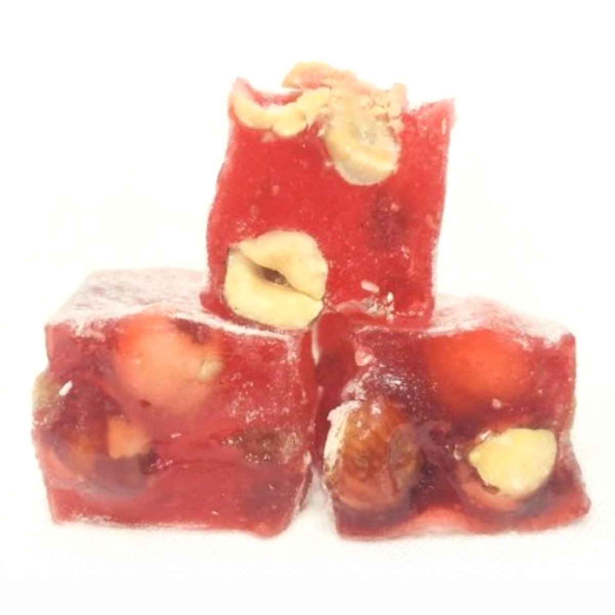 Сахар белый, вода питьевая, крахмал кукурузный, лимонная кислота пищевая, клюква, фундук, яблочная кислота, ванилин, краситель красный синтетический.