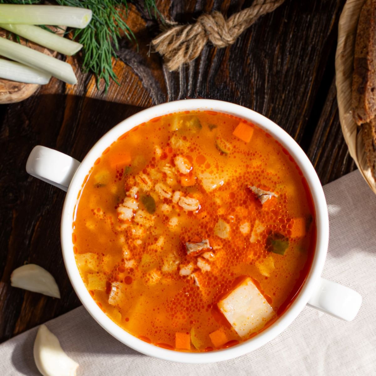 Известный русский суп по оригинальному рецепту. Наваристый мясной бульон, сочная говядина, картофель, морковь, соленые огурцы, корень сельдерея и душистые приправы. Имеет острый кисловатый вкус и пряно-овощной аромат. Обязательно попробуйте с нашей домашней сметаной и зеленью.