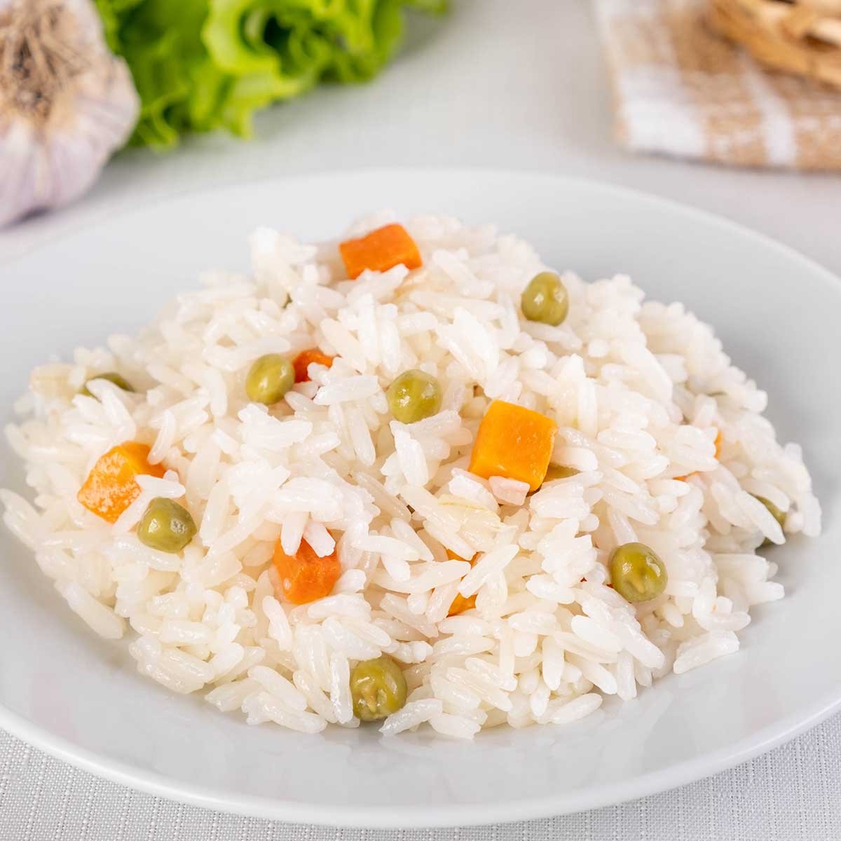 Ароматный, яркий гарнир для всей семьи. Рис длиннозерный отваривают до готовности, смешивают с пассерованными овощами добавляют консервированный горошек, сдабривают оливковым маслом. Прогревают на пару.
