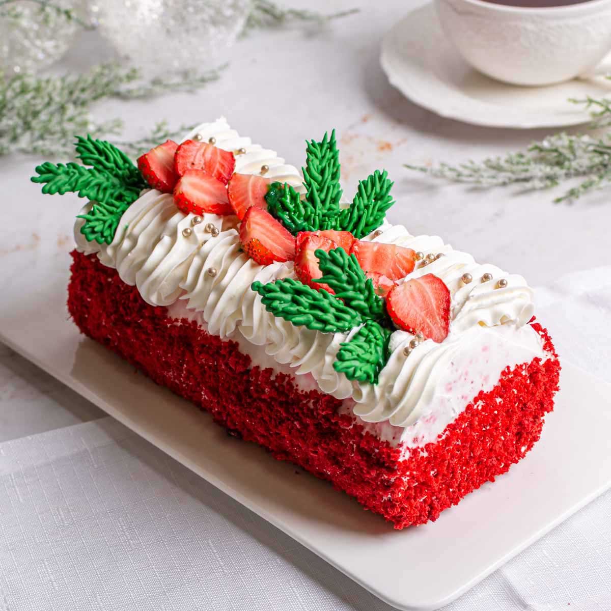 Алый рулет из шифонового бисквита с творожным кремом. Нежное лакомство, в котором гармонично соединяется шоколадный, сливочный и ягодный вкус. Мы украшает яркий десерт декоративными веточками из глазури и свежей сочной клубникой. Аппетитное украшение для вашего праздничного стола.