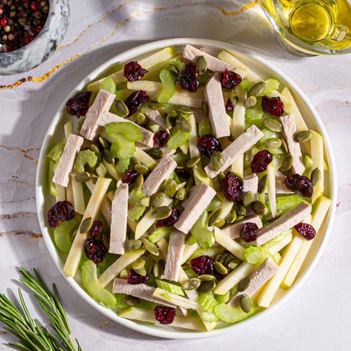 Грудка индейки, яблоки свежие, стебель сельдерея, семя тыквенное, клюква сушеная, масло подсолнечное, мед, сок лимона, апельсин (сок), мята свежая