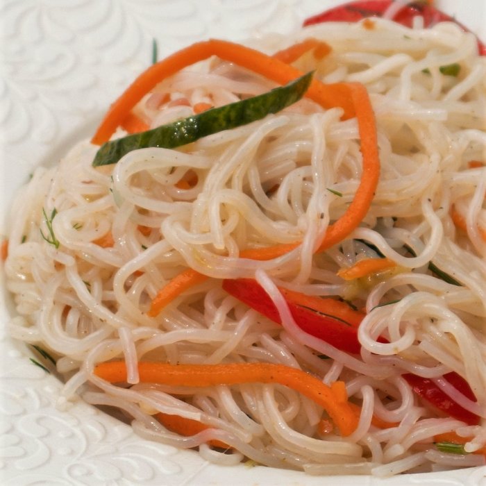 «Стеклянная лапша» в сочетании со свежими огурцами, болгарским перцем, морковью и ароматной восточной заправкой. Свежий, хрустящий салат, который может легко заменить полноценный обед. Закуска отлично подходит для постного и веганского меню.