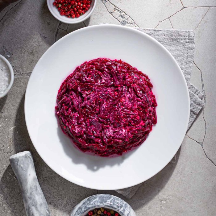 Сочная отварная сладковатая свекла под майонезом с добавлением пикантного чеснока. Простое, но изысканное и гармоничное сочетание вкусов. Идеальный салат на каждый день и отличная начинка для наполнения тарталеток.