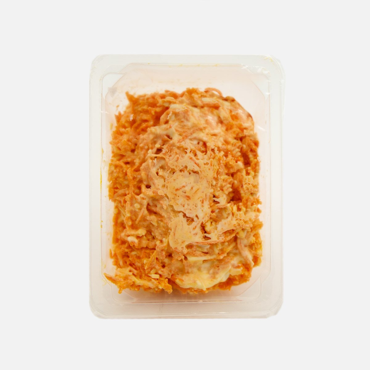 Морковь свежая, чеснок свежий, сыр, майонез. Упаковано с применением условий модифицированной атмосферы.