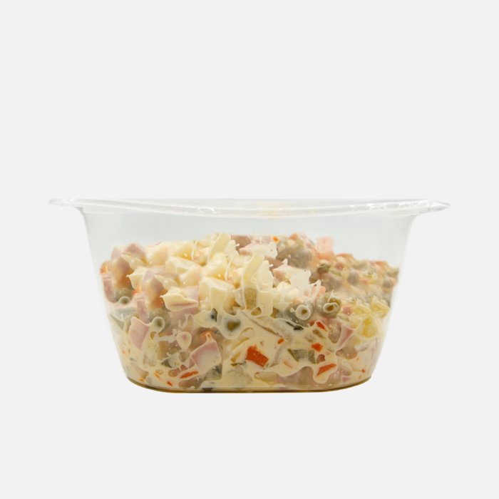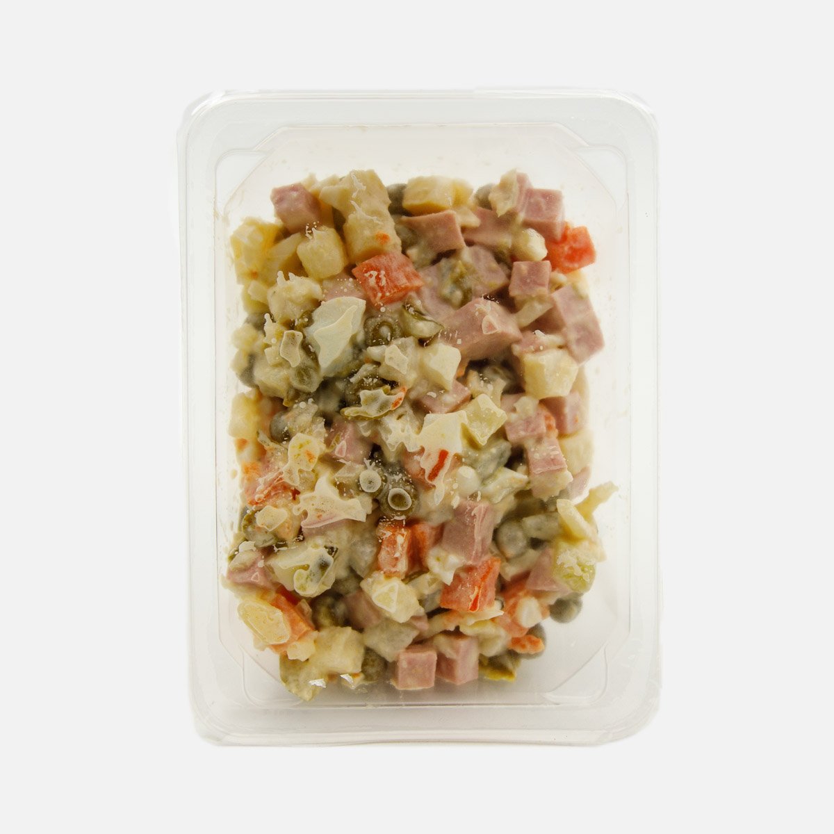 Один из самых любимых классических салатов, который, безусловно, является неотъемлемой частью праздничного стола. Закуска приготовлена из отборных отварных и консервированных овощей, сочной вареной колбаски, ароматной зелени и щепотки специй. Салат имеет привычный сбалансированный вкус с легкой кислинкой маринованных огурцов и сливочными нотками соуса.