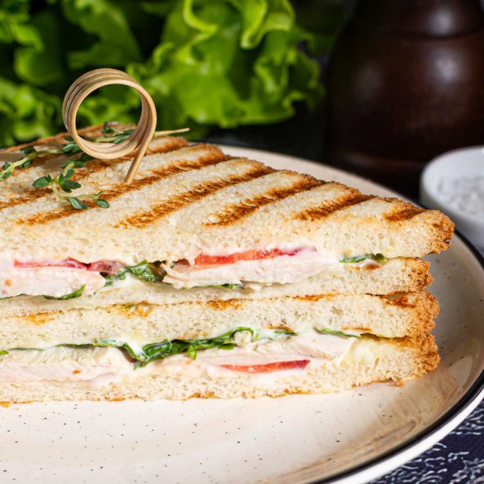 Хлеб для сэндвичей, филе цыпленка, сыр плавленый, томаты, лист салата Айсберг.