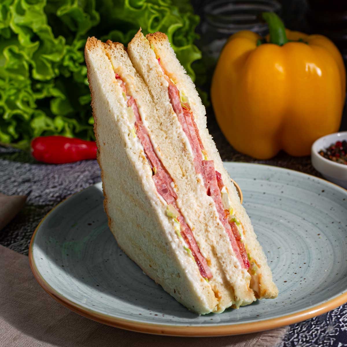 Домашний сэндвич, приготовленный на гриле. Пикантный сервелат, сладковатые томаты, свежий салат и нежный плавленый сыр. Каждый из ингредиентов успешно гармонирует друг с другом, составляя вкусное и сбалансированное блюдо. Отличный вариант для быстрого, но качественного перекуса!