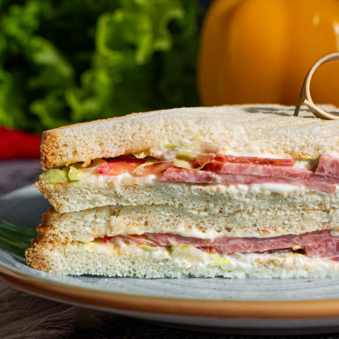 Хлеб для сэндвичей, сервелат полукопченый, сыр плавленый, томаты, лист салата Айсберг.