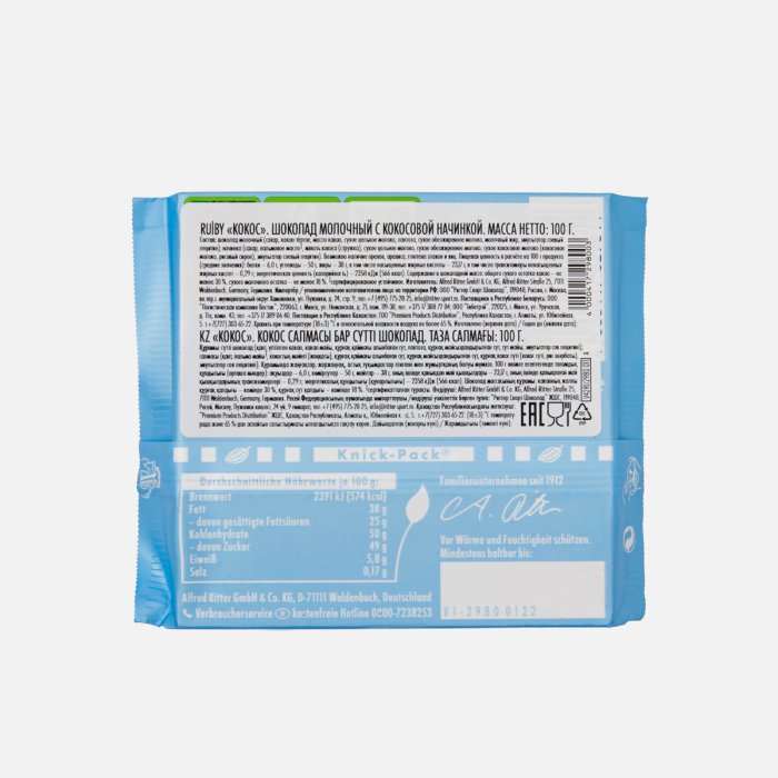 Шоколад Риттер Спорт молочный с кокосовой начинкой 100г