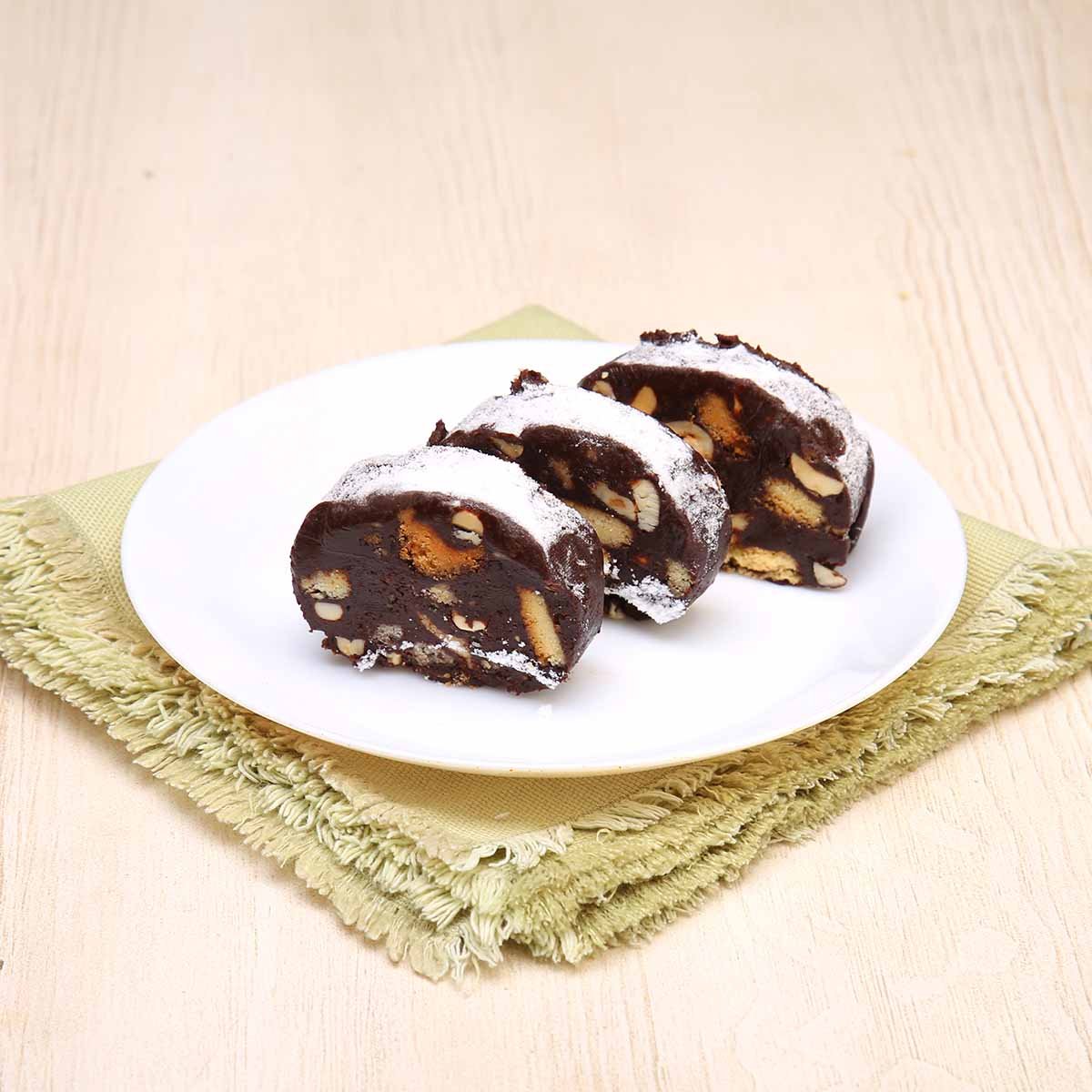 Вкус детства. Сочная шоколадная колбаска с фундуком и миндалем в легком облаке сахарной пудры. Десерт из натуральных продуктов с богатым насыщенным вкусом и приятной хрустящей текстурой. Идеально для семейного чаепития.
