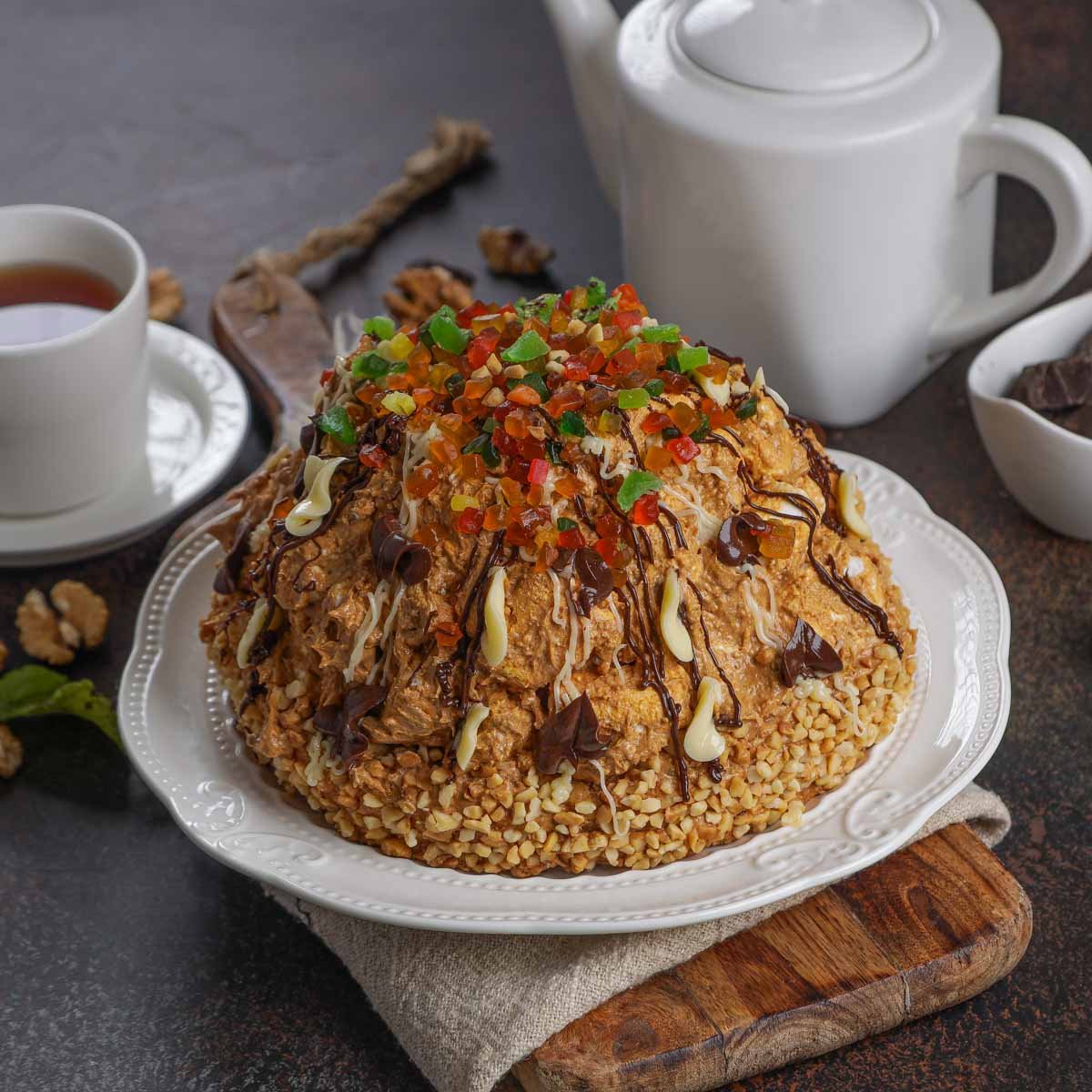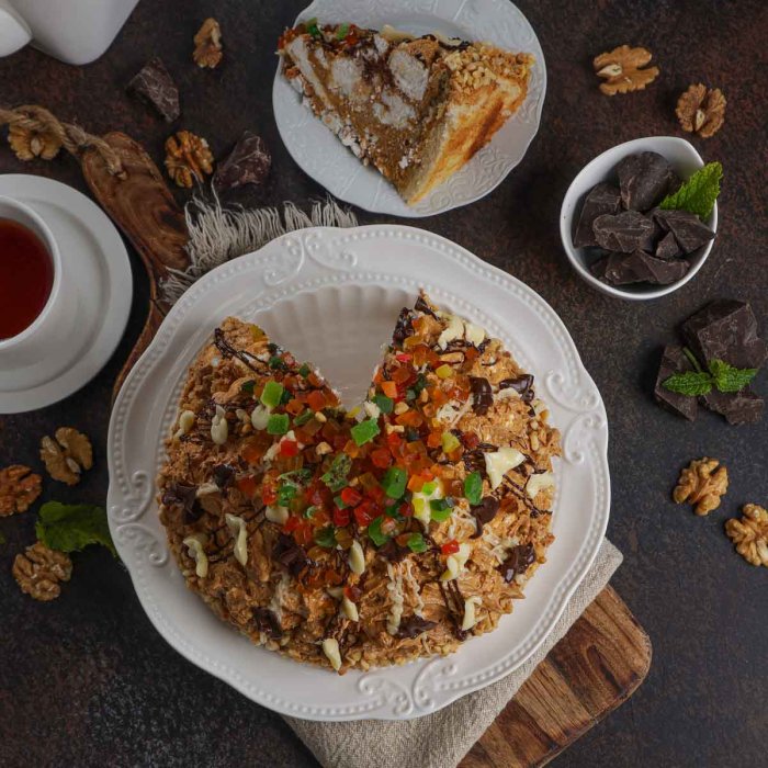 Мука пшеничная в/с, молоко сгущенное вареное, масло сливочное, сахар-песок, молоко сгущенное, какао, яйцо куриное, арахис, цукаты фруктовый салат, ванилин, коньяк, лимонная кислота