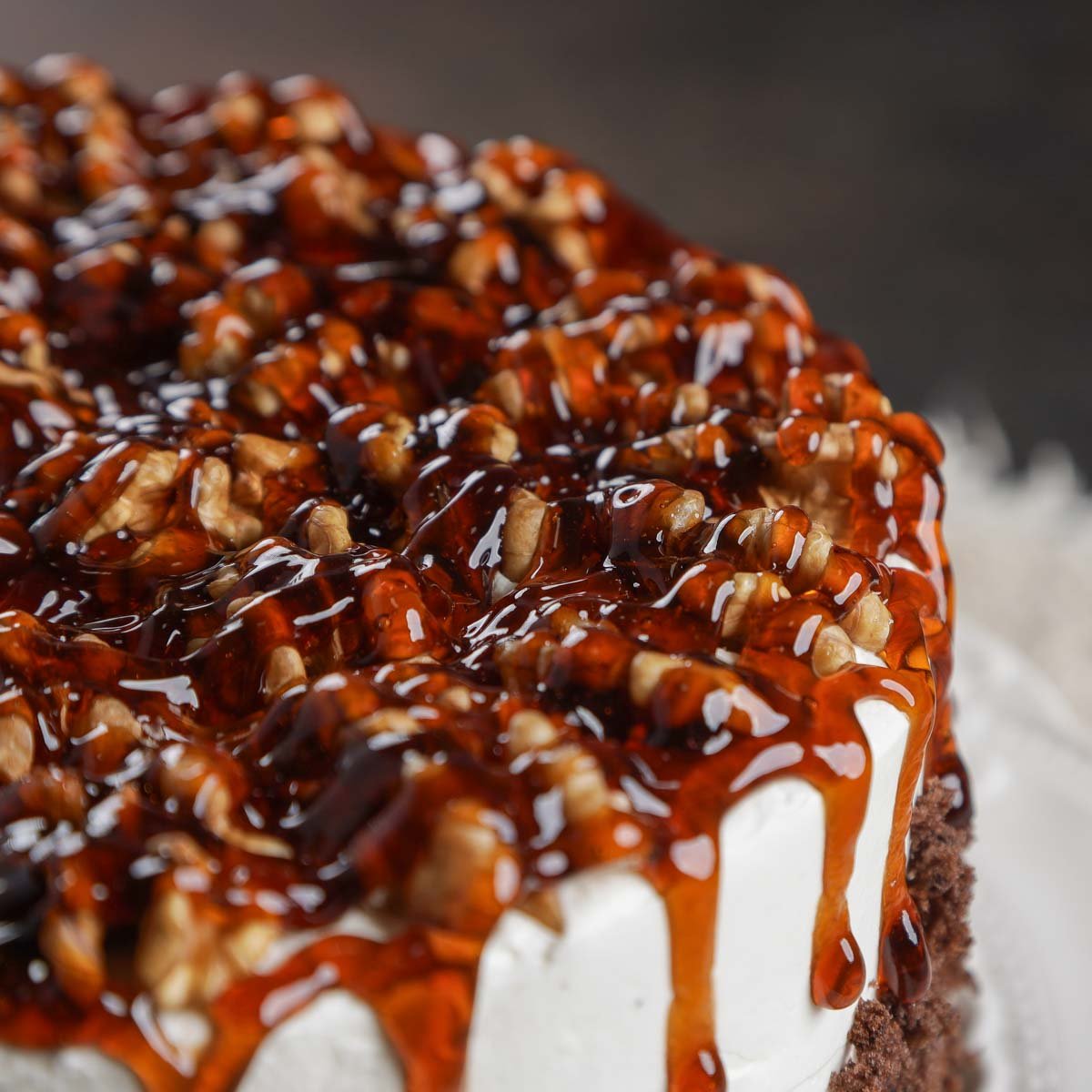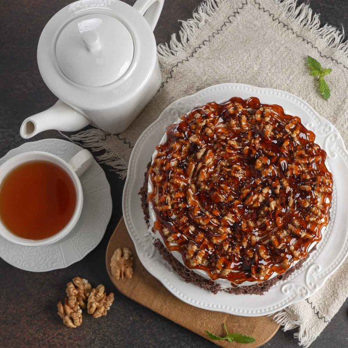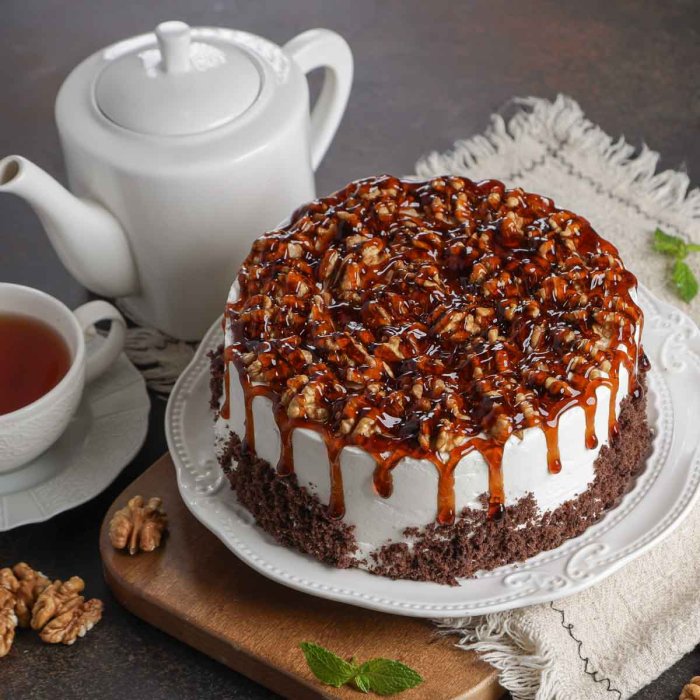 Яйцо куриное, сахар-песок, мука пшеничная в/с, орех грецкий, сгущенное молоко, сливки растительные, гель карамель, какао-порошок, крахмал картофельный