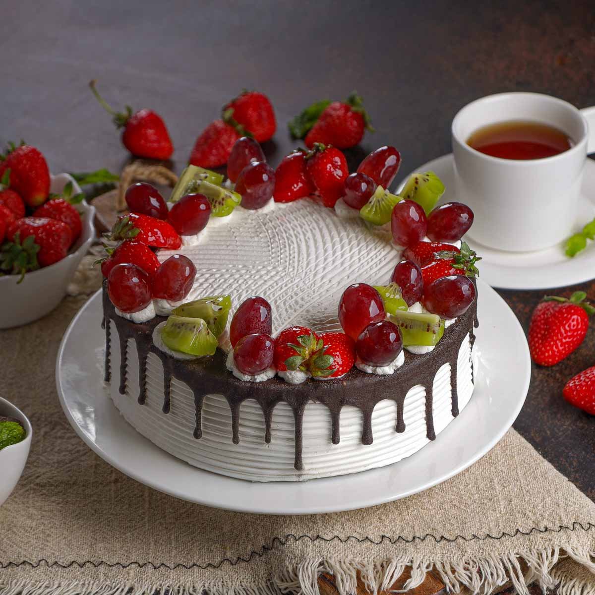 Мука пшеничная в/с, яйцо куриное, виноград, клубника, киви, сахар-песок, крахмал картофельный, крем шоколадно-ореховый, клубника с/м, сливки растительные, шоколадная глазурь, гель нейтральный, коньяк