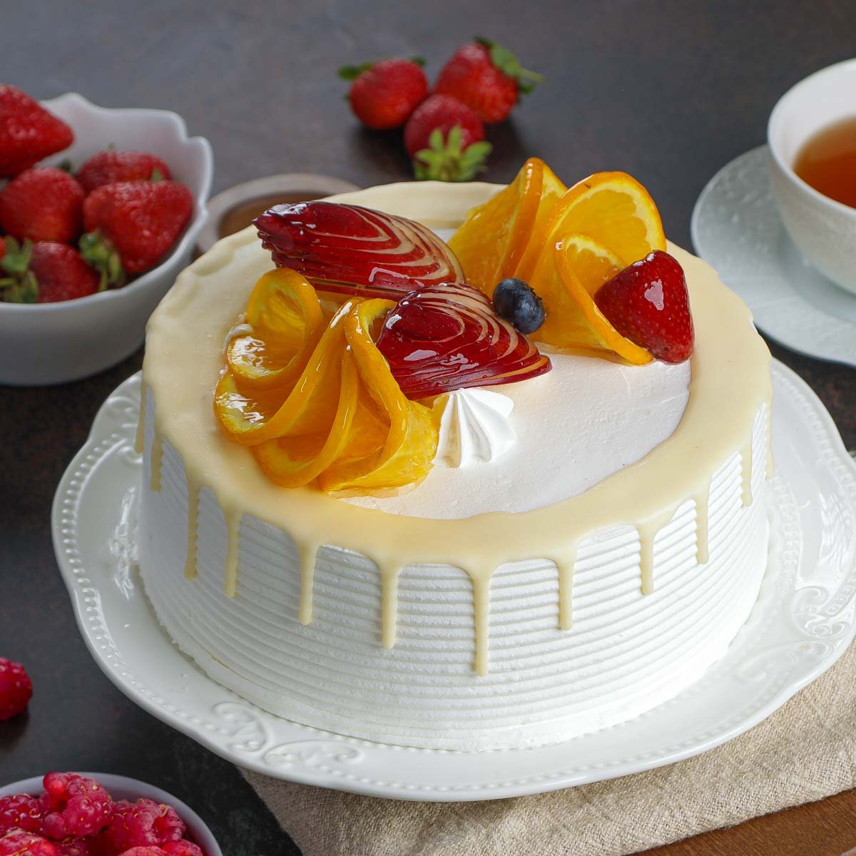 Йогурт натуральный, сливки натуральные, сливки растительные, черника с/м, яблоко, апельсин, сметана, яйцо куриное, сахар-песок, мука пшеничная в/с, шоколад белый, клубника свежая, голубика, крахмал картофельный, желатин, глазурь нейтральная, коньяк, загуститель