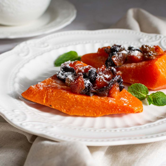 Полезное и ароматное лакомство из сочной, солнечной тыквы, которую мы запекли с мёдом, изюмом, черносливом и курагой. Освежающий вкус яркого овоща идеально напитывается сладостью и лёгкой фруктовой кислинкой, даря натуральный и гармоничный вкус. Вкусный, диетический десерт из отборных продуктов!